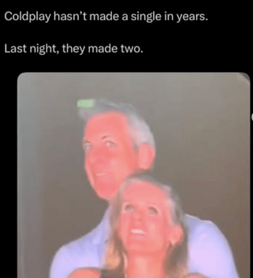 If I may address the philandering couple directly: What the fuck were you thinking? You’re carrying on an illicit affair in a public place, specifically an event venue with a seating capacity of almost 65,000 people. There are cameras everywhere, including in the hands of virtually everybody in attendance. You may have figured if Joe Blow TikTok records the entirety of “Yellow” and the two of you happen to be in frame, whatever; he’s one guy and he’s probably got fewer than thirty followers, and at any rate, the odds of him recording something more revealing than the backs of your heads are slim.